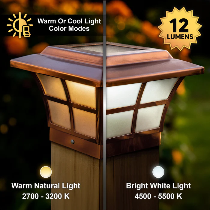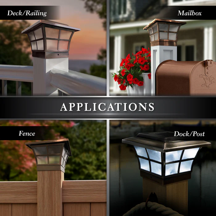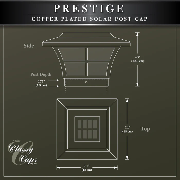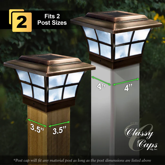 The 4×4 copper Prestige solar post cap is finished in a rich antique electroplated copper. Stylish and durable performance you can depend on. Our patented window frame design with frosted lens will create a unique ambiance. Will fit over an actual 4″x4″ or 3.5″x3.5″ post (3.5″x3.5″ adapter included).