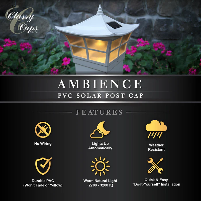 Inspired by the elegance of Japanese garden design, the Classy Caps Ambience Solar Post Cap adds a touch of serene beauty to your outdoor space. Featuring a warm, flickering yellow light that mimics the soft glow of a candle, creating a cozy and inviting atmosphere. Combining unique style with reliable solar-powered performance, this post cap is designed to fit perfectly over a standard 4″x4″ and 5″x5″ post, making it a charming and functional accent for your deck, fence, or garden.