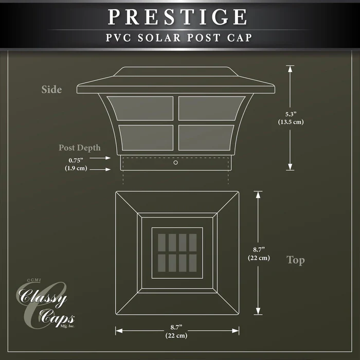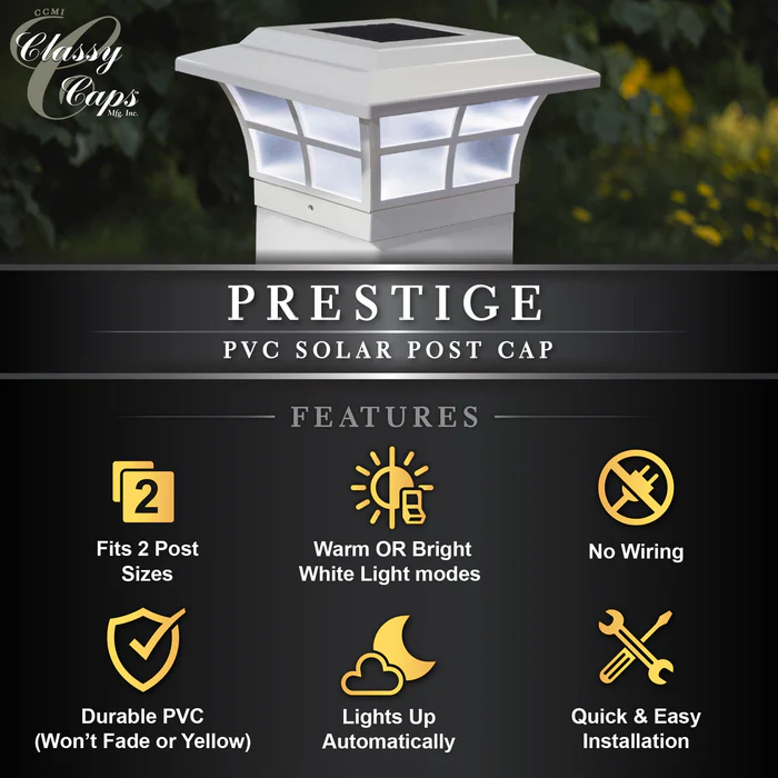 The 5×5 white PVC Prestige solar post cap is stylish and durable with performance you can depend on. Our patented window frame design and frosted lens create a unique ambiance. Will fit over an actual 5″x5″ or 4.75″x4.75″ post (4.75″x4.75″ adapter included)