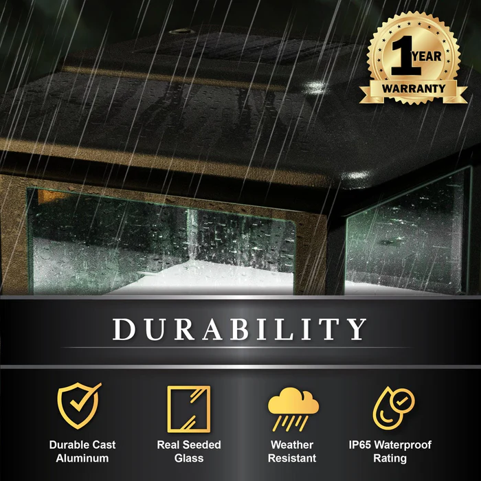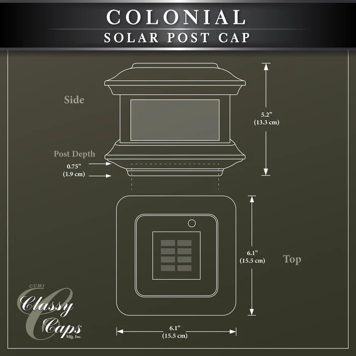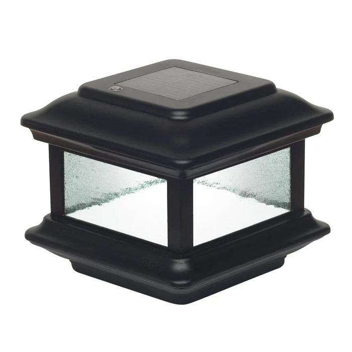 Fabricated from durable cast aluminum with powder coated finish, the Colonial Solar Post Cap is designed to fit over a nominal 4″ x 4″ wood post. (Actual dimension of opening: 3-5/8″x3-5/8″). The attractive Colonial is complimented by using real seeded glass panels. Built to our stringent quality standards it will stay lit for up to 12 hours.