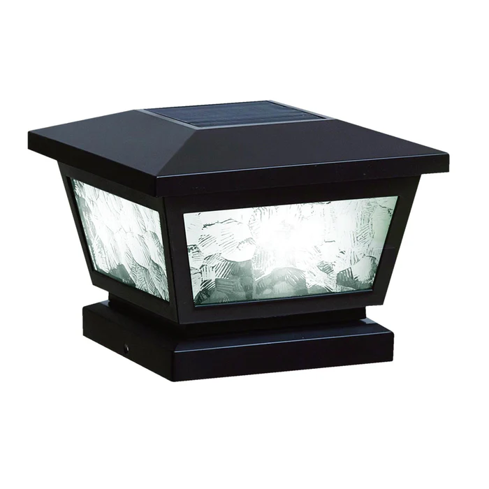 The novel all weather versatile Black Fairmont Solar Post Cap can be used for post or wall mount with easy installation. It is complimented using real pebbled glass and two high-output LED’s that will cast a brilliant white light. Will fit over 3 post sizes – 5×5, 4×4 or 3.5×3.5″ post. (Wall adaptor included)