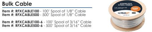 - Two options for cable thickness, are 1/8” and 3/16”. The cable comes in 100’ and 500’ lengths.