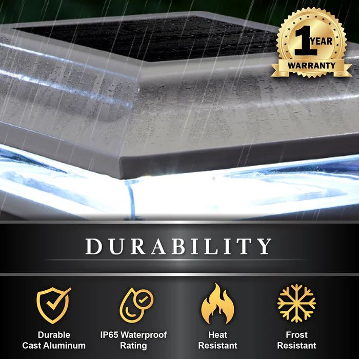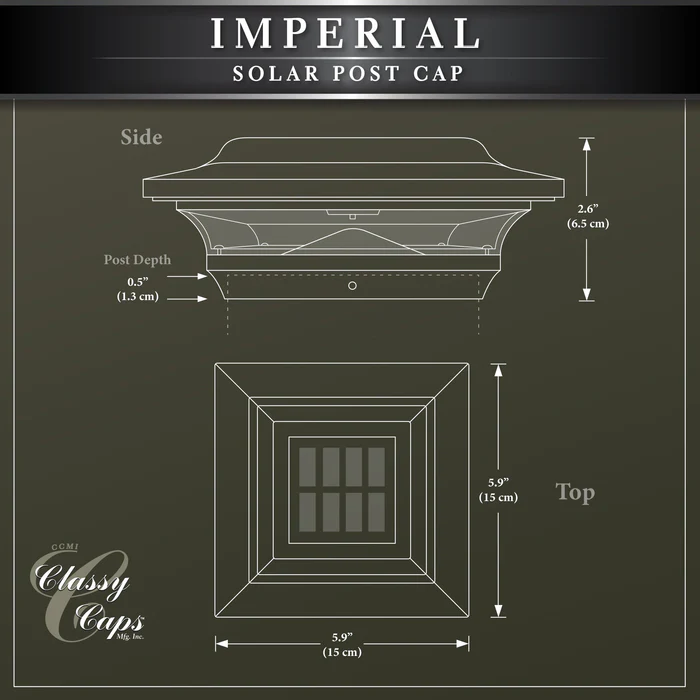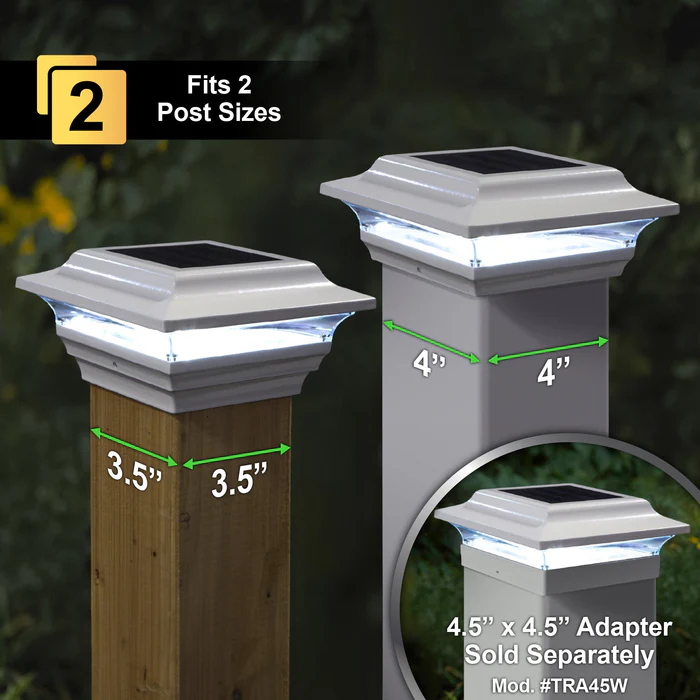 The modern yet elegant Imperial Solar Post Cap offers a clean contemporary design that is unequalled in performance. Its rugged cast aluminum construction with powder coated finish means no future painting. The Imperial will fit over an actual 4″x4″ or 3.5″x3.5″ post. (3.5″x3.5″ adaptor included)