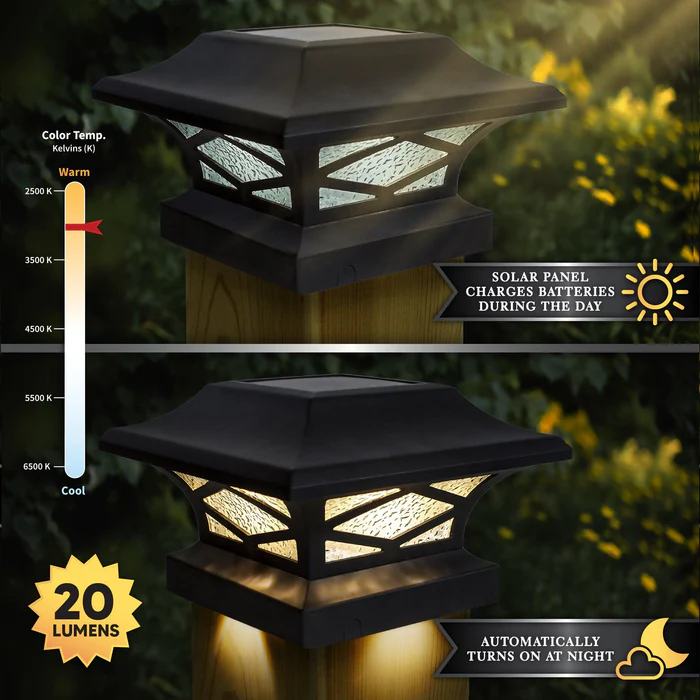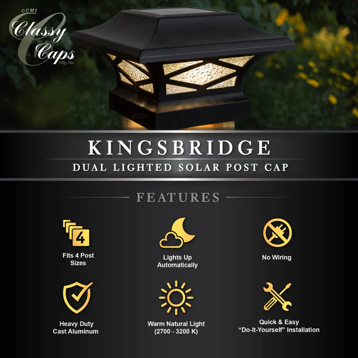 Introducing the durably crafted Kingsbridge dual lighting solar post cap, designed and manufactured only by Classy Caps Mfg. Inc. This unique, one-of-a-kind Solar Post Cap is a one cap fits all patent pending design with the versatility to fit over four standard-size posts. The cast aluminum Kingsbridge exudes quality, offering a monocrystalline solar panel and 3.2V LifeP04 rechargeable battery for many years of maintenance-free reliability. The real pebbled glass lens and strategically placed surface mount LED’s will cast magnificent warm lighting accents to highlight your fence, deck, landscape and more. Your neighbors will most certainly be envious of the Kingsbridge Dual Lighting Solar Post Cap that is truly fit for a King!