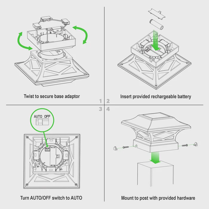 • 4 ABS base adaptors included to fit over an actual 3.5″x3.5″ (4×4 nominal), 4″x4″, 5″x5″ or 5.5″x5.5″ (6×6 nominal) post