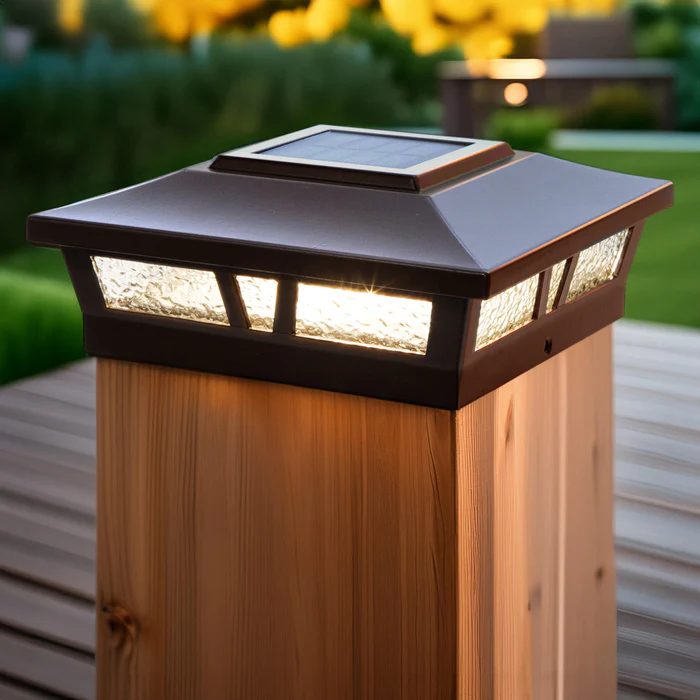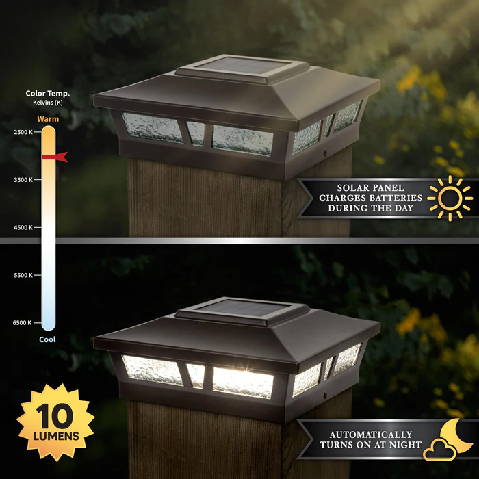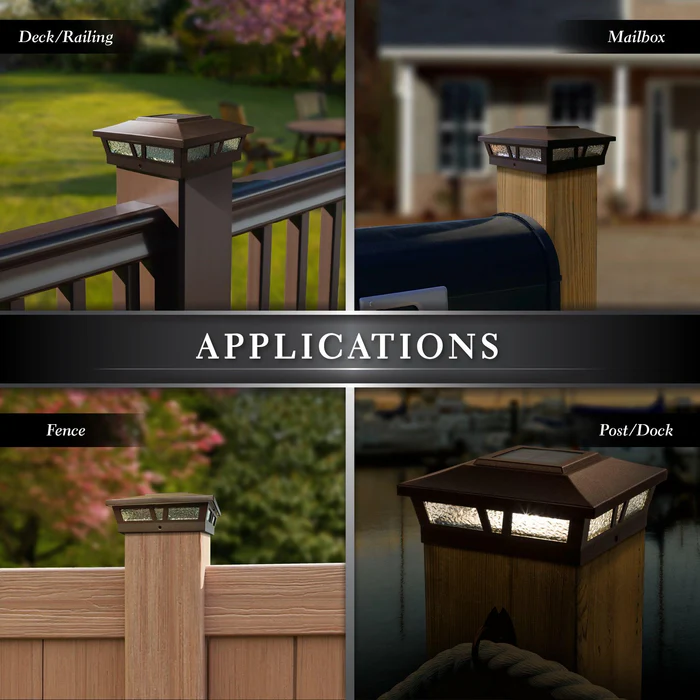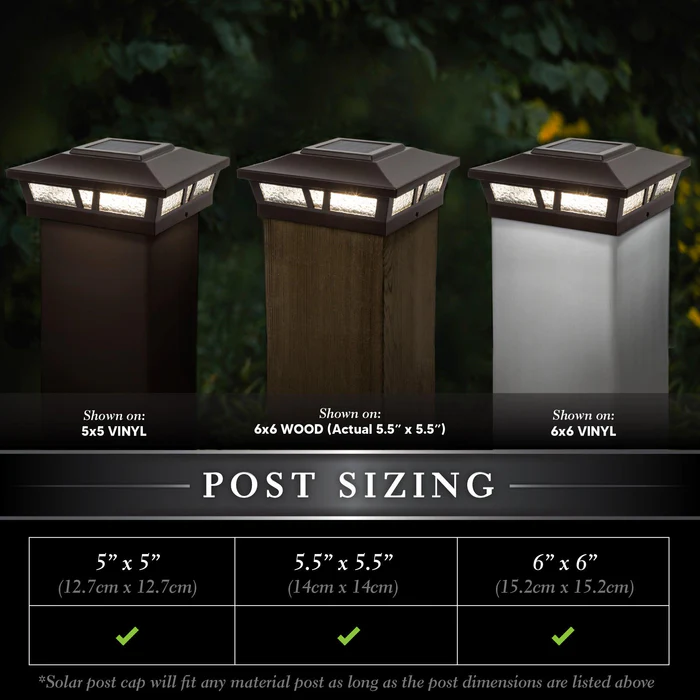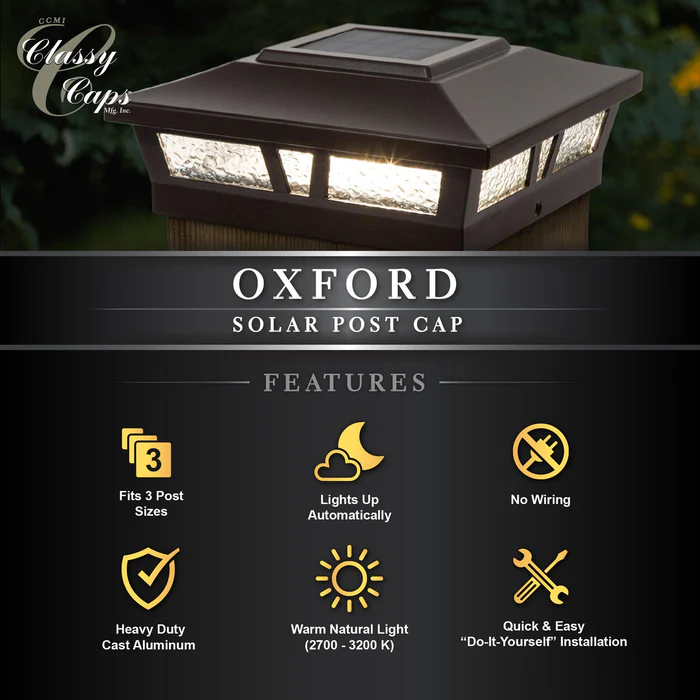 Similar in design to our low-profile Cambridge solar post cap, the Oxford is manufactured from heavy-duty, weather-resistant cast aluminum with a durable powder coat satin finish that is offered in three colors. Featuring a unique decorative glass lens and two surface mount LED’s, the 6×6 Oxford Solar Post Cap will cast a warm natural light that will automatically light up at dusk creating a picturesque landscape for your fence, porch, or deck. Another superior design by Classy Caps. Adaptor included to fit over 3 post sizes – an actual 6″x6″, 5.5″x5.5″ or 5″x5″ post.