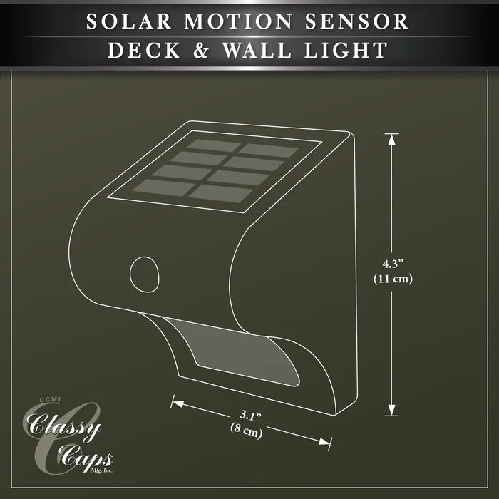 Our truly innovative solar motion sensor deck & wall light has a compact design making it a perfect accent that can be placed almost anywhere, adding a sense of security to your home. The light will automatically stay on a low setting at night, the sensor will activate a super bright light when motion is detected. It installs in minutes and is perfect for stairways, decks, docks, posts and door entrances.