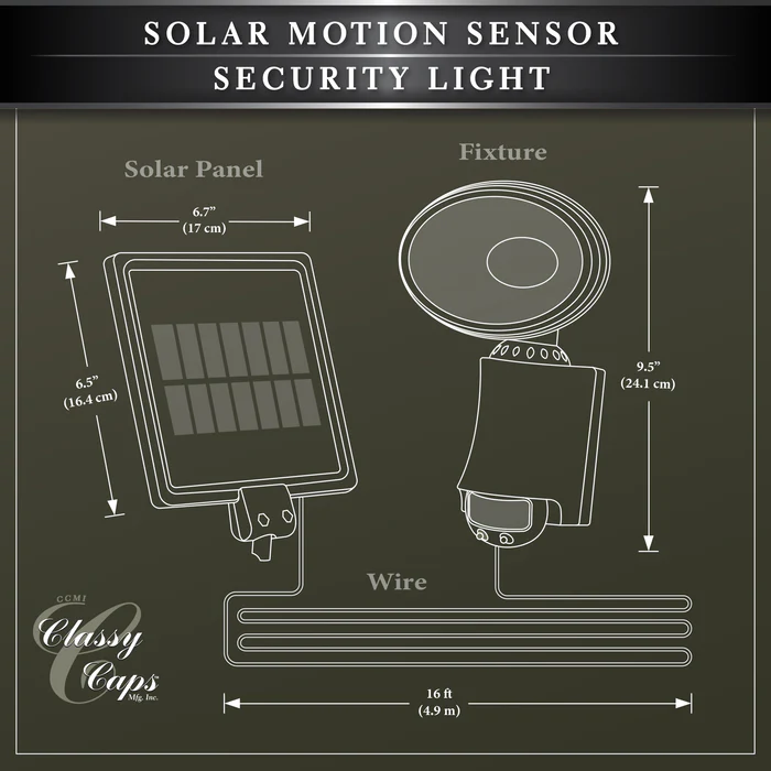 Protect buildings, homes and cottages with Classy Caps motion sensor security light. Potential intruders are discouraged by an automatic brilliant white light that is triggered by an infrared motion detector. Our unique solar powered design eliminates the use of electricity. Quick and easy installation with our mounting hardware provided.