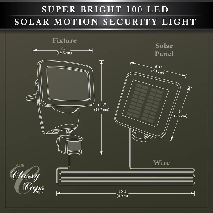 Classy Caps 100 LED’s super bright Solar Motion Sensored Security light is sure to effectively illuminate any outdoor area such as your home, business, driveway, parking lot, loading dock and entrance way.  With its 180 degree motion sensor detection range & up to 10 meter (30 ft) detection distance this powerful 600 Lumen bright white  solar motion sensored security light is adjustable and will stay on for a time range of 10 seconds to 2 minutes. The solar panel can be mounted up to 4.5 meters away from the light fixture.  Installs easily with included wall mount and hardware.